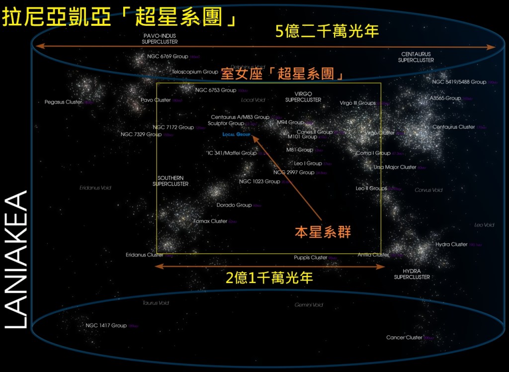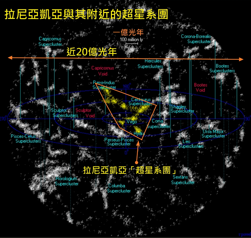 底下圖示,為拉尼亞凱亞與其附近的超星系團,共組成橫跨近20億光年的更大超星系團集合。