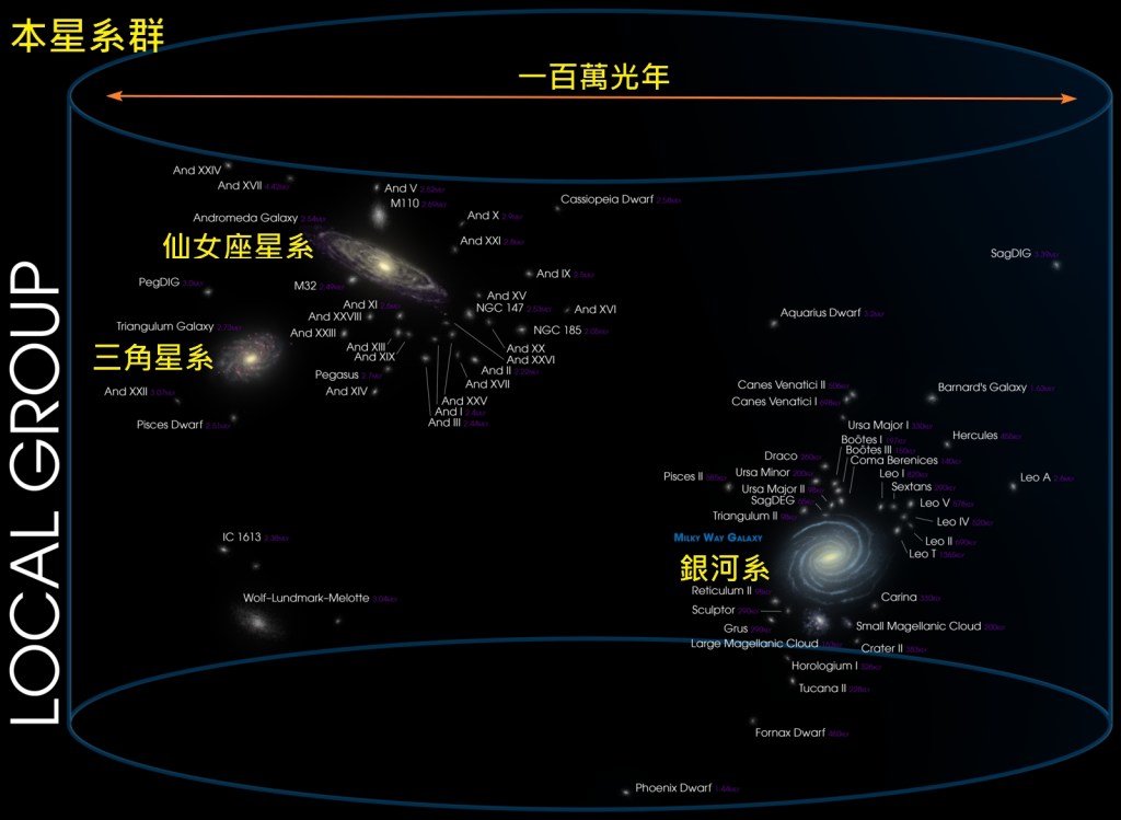 但即使如此廣袤的銀河系,在宇宙中,也只是滄海之一粟。我們的銀河系和其它五十多個星系,組成了「本星系群」(Local Group),本星系群的跨度約一百萬光年。