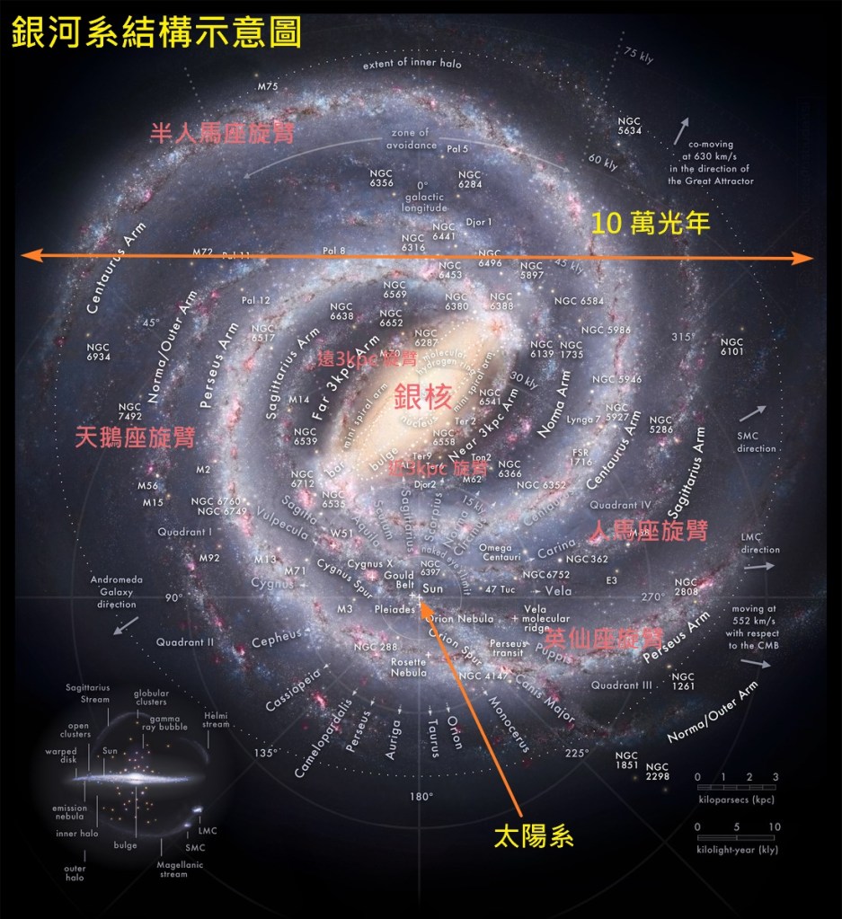 我們的太陽系,位於銀河系邊緣的旋臂之中,而我們所處的銀河系,其中含有超過1000億顆以上的恆星,跨度約10萬光年之廣,10萬光年是一個什麼樣的概念呢?光速每秒約30萬公里,光只要一秒鐘,就可繞地球七圈半,而光要整整走10萬年,才能從銀河系的東邊,走到銀河系的西邊,這是一個令人震驚的時空概念。